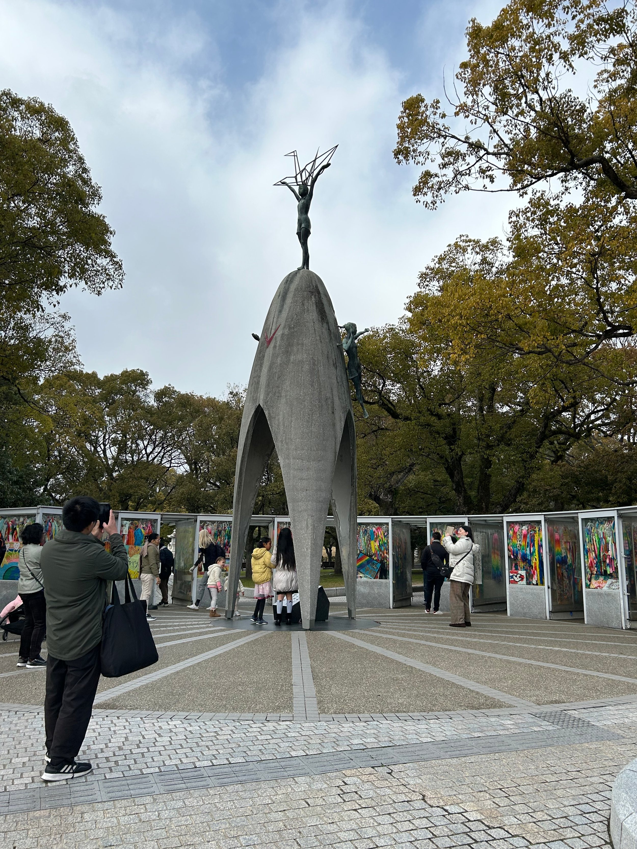 Hiroshima’s Peace Memorial Park is a beautiful and mournful place. The weight of the 1945 tragedy in Hiroshima is felt perhaps most fiercely at the Children’s Peace Monument, which honors Sadako Sasaki and the many thousands of children who died as a result of the nuclear bomb and its fallout. Sadako was two years old when the bomb as dropped on her city. Sadako survived, but later developed leukemia as a result of radiation exposure. She began folding origami paper cranes, hoping to reach 1,000 of them, which Japanese legend said would heal her. Sadako died at age 11, several hundred cranes short of her goal. Her distraught classmates came together to finish the remaining cranes. Schools around the world sent money, and paper cranes, and as a result of these donations, the Children’s Peace Monument was constructed. Children and visitors still make, send, and leave paper cranes at the monument. Our son and nephew added their paper cranes, which they made in their origami workshop in Tokyo.
