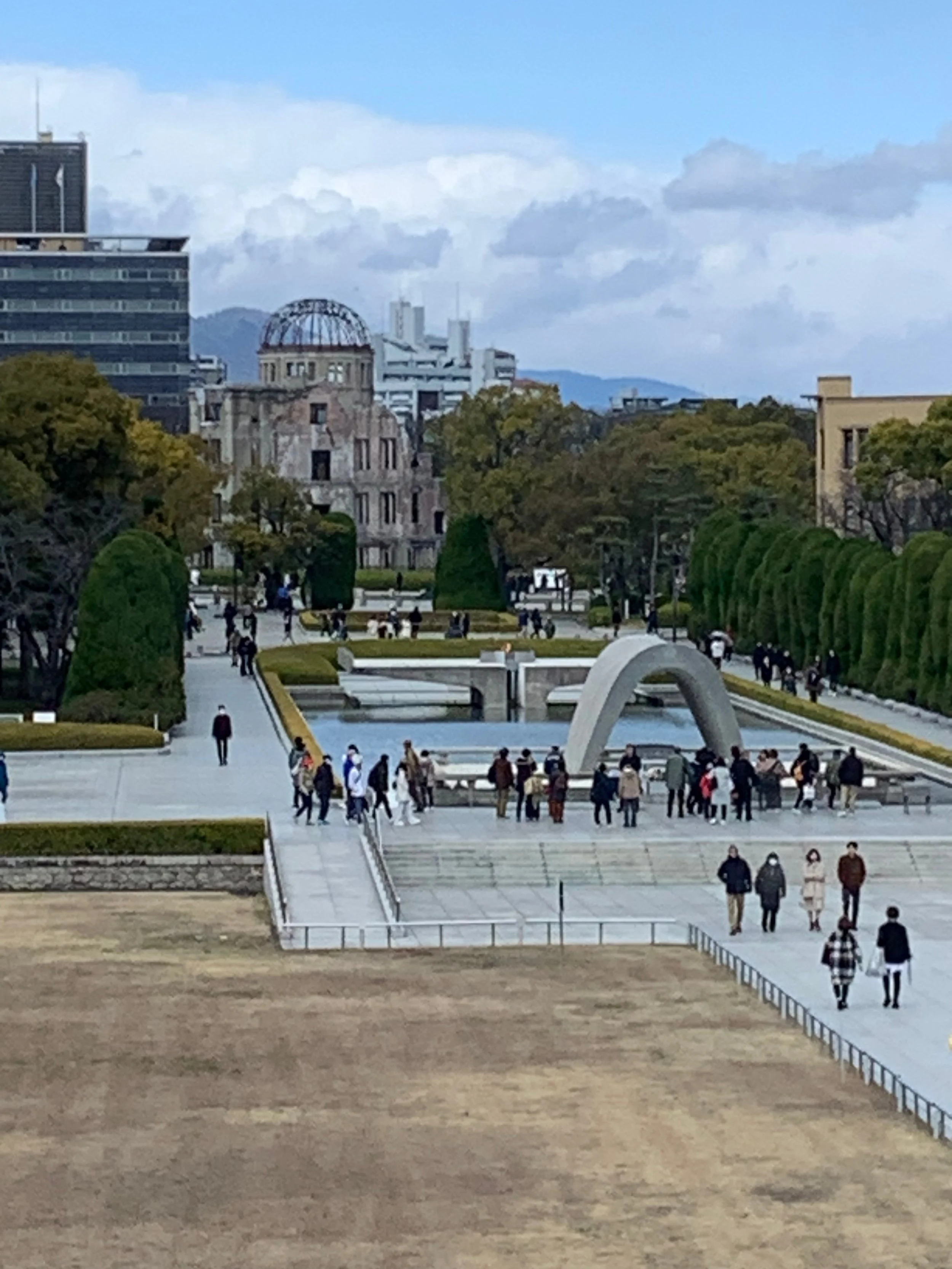 It’s a long day, but worth it to take this side trip from Kyoto to see impactful Hiroshima and beautiful Miyajima Island. We took at 6:55 am train from Kyoto, arriving in Hiroshima at 8:36 am. Then we transferred directly to a train to Miyajimaguchi, got off, and followed the arrows on the ground to the ferry to Miyajima Island. I was glad we left early because we were able to see the Torii Gate and the ancient Shinto Itsushukima Shrine before the crowds. Note that the Torii Gate is a different experience depending on the tide. I wanted to see it at high tide, when it was partly under water so it looked like it was floating. Others prefer to see it at low tide, when you can walk right up to it. There is a small town on Miyajima, where you can hit a cafe for a coffee and a snack. Others are delighted by the opportunity to get close to the deer that populate the island, but living just a handful of towns away from Lyme, Connecticut, we took a pass. If we had had more time on the island, I would have loved to walk to Daisho-in Temple at the base of Mount Misen, or even hike up to Misen’s summit. Miyajima Island is beautiful and it was nice to be out of the city and in nature. After our visit to Itsushukima Shrine, we took the ferry and then train back to Hiroshima where we hoped to try Osaka-style savory pancakes at Okonomiyaki Nagata-ya, but so did everyone else and we faced a 90-minute wait. Instead, we found a French bakery in the nearby covered pedestrian shopping street, then went on to Hiroshima’s sites.