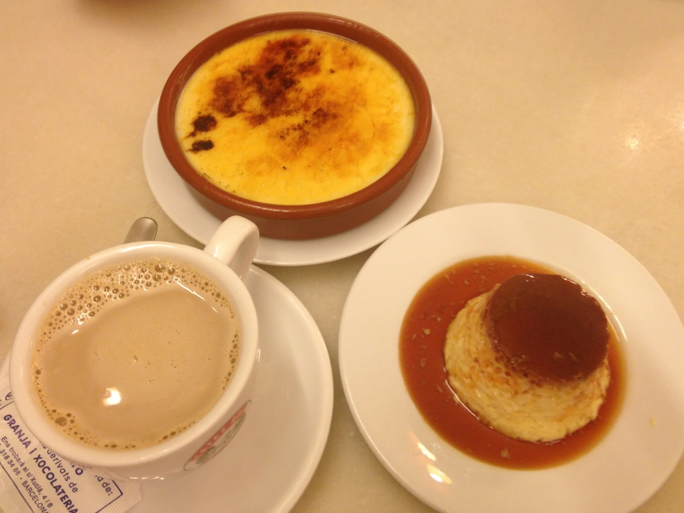 Dessert: Cafe Granja Viader (on Xucla, off Las Ramblas behind Betlem Church) is a cute cafe that has good crema catalana and churros with hot chocolate. The hot chocolate at the Chocolate Museum is amazing, and our favorite churros were in a tiny shop on Princesa Street. If you walk on Princesa Street east of Jaume I metro stop toward the Chocolate Museum, on the right-hand side of the street there is a hole-in-the-wall place with a woman making churros. On the same side of the street nearby is an "organic bakery," which had delicious sweet treats (the savory ones were just okay).